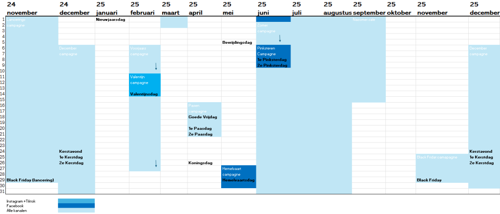 Voor het luxe, verstelbare koffermerk Payanta heb ik een contentplanner ontwikkeld die inspeelt op feestdagen, vakanties en nationale dagen (zoals Valentijnsdag). In de planner staat aangegeven wanneer de socialmediacampagne loopt en op welk socialmediaplatform de campagne draait. De kalender is opgesteld voor de periode van november 2024 tot en met december 2025.