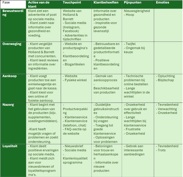 Om te bepalen op welke fase van de customer journey van Holland & Barrett het beste kan worden ingezet, heb ik de volledige customer journey in kaart gebracht. De gekozen doelgroep bestaat uit gezondheidsbewuste volwassenen, met als subdoelgroep vegetariërs en veganisten. Per fase is er specifiek gekeken naar: