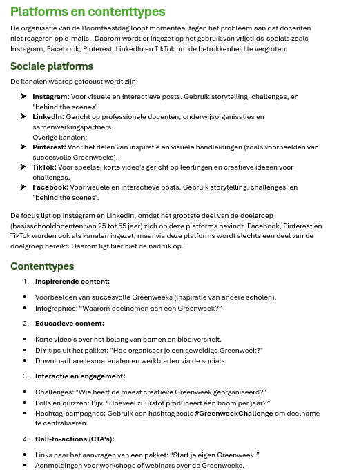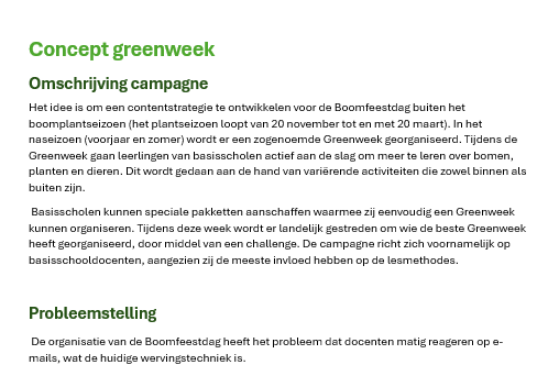 Het concept van de Greenweek voor de Boomfeestdag was al ontwikkeld door de eerste groep van de verdiepingsfase. De vraag van de opdrachtgever was om het concept verder door te ontwikkelen tot een uitvoerbaar plan met bijpassende content.