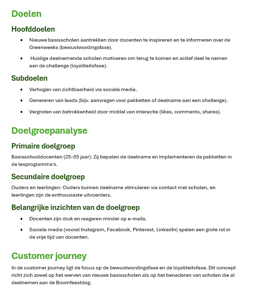 Om duidelijk te maken waar, wanneer en waarvoor content geplaatst wordt, ben ik aan de slag gegaan met het ontwikkelen van een contentstrategie voor het Greenweek-concept. In de strategie staat beschreven wat het concept inhoudt, wie de doelgroep is waarop wordt gefocust, wat de doelen zijn en op welke momenten in de customer journey er wordt ingezet met social media.