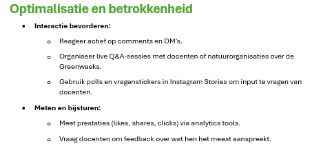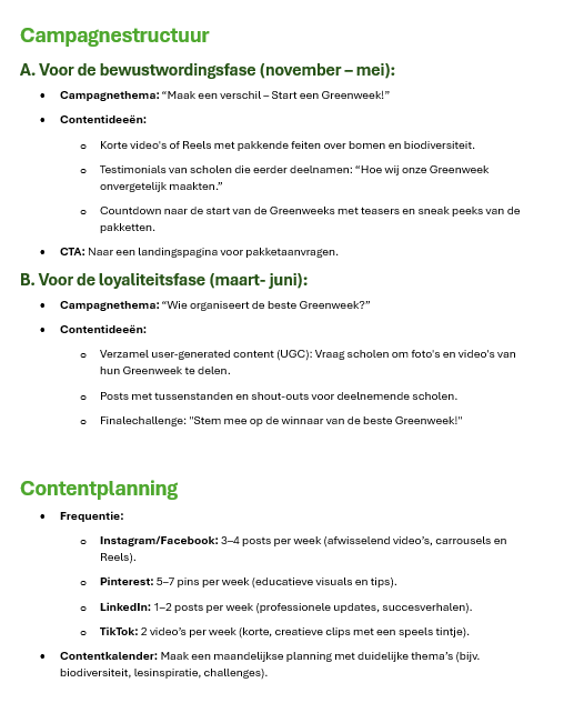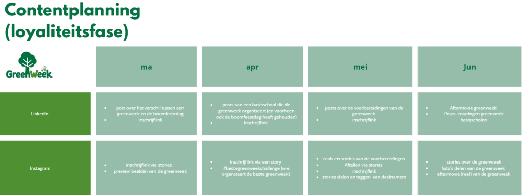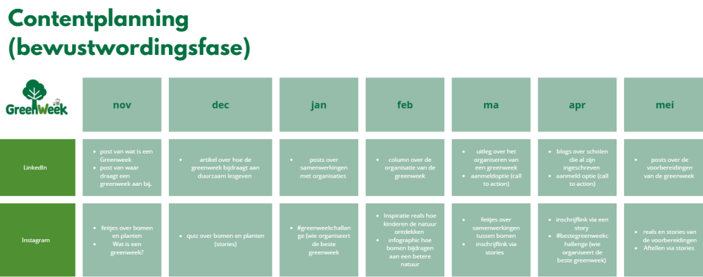 Na het maken van een contentstrategie voor de Greenweek heb ik een planning opgesteld voor de campagne. In deze planning heb ik duidelijk weergegeven wanneer de campagne plaatsvindt (zie versie 1)