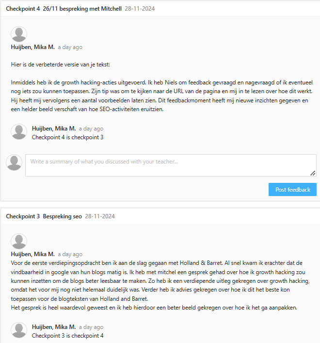 Al deze acties hebben ervoor gezorgd dat ik een helder beeld heb van waar ik momenteel sta met mijn kennis op het gebied van digitale marketing. Achteraf vond ik het in de eerste weken lastig om feedback te vragen, vooral bij groepswerk. Hoewel ik het nog steeds lastig vind, wil ik mezelf in de laatste weken van mijn minor hierin trainen, zodat ik hier sterker in word.