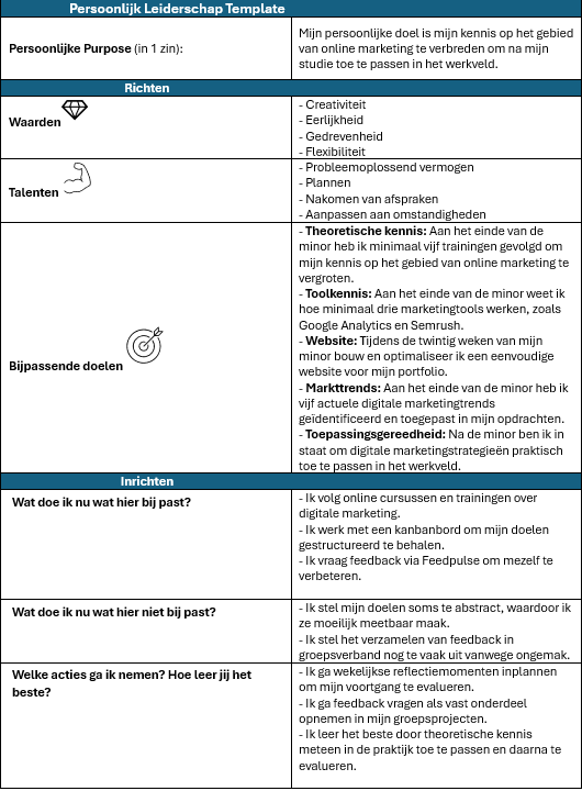 Om ervoor te zorgen dat dit mijn ontwikkeling niet zou belemmeren, heb ik halverwege de minor een persoonlijk leiderschap-template ingevuld. Ik merkte dat dit mij houvast gaf en inzicht bood in hoe ik mijn vaardigheden kon toepassen bij de leeruitkomsten. Daarnaast hebben de feedbackmomenten met docenten mij geholpen om een beter beeld te krijgen van mijn ontwikkelingsproces. Ik kan concluderen dat ik gegroeid ben in mijn persoonlijk leiderschap. Ik weet nu beter waar ik sta met mijn kennis van digitale marketing en wat ik heb geleerd.