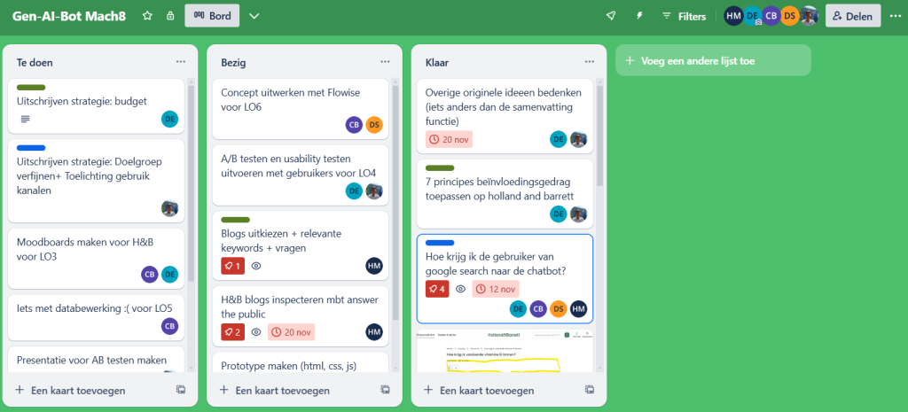 Tijdens het eerste project van de verdiepingsfase heb ik samen met mijn projectgroep gewerkt in Trello. Hierin maakten wij gebruik van een to-do-, mee-bezig- en klaar-lijst. Dit is geïnspireerd op de Kanban-methode. De kennis over de Kanban-methode heb ik opgedaan tijdens de workshop van Hanneke, die over dit systeem ging. In het verleden had ik al eens van deze methode gehoord, maar ik had er nog nooit mee gewerkt. Persoonlijk vond ik het een prettig systeem om mee te werken. Het geeft mij meer structuur in het werk en maakt duidelijk wie wat doet binnen een groepsverband.