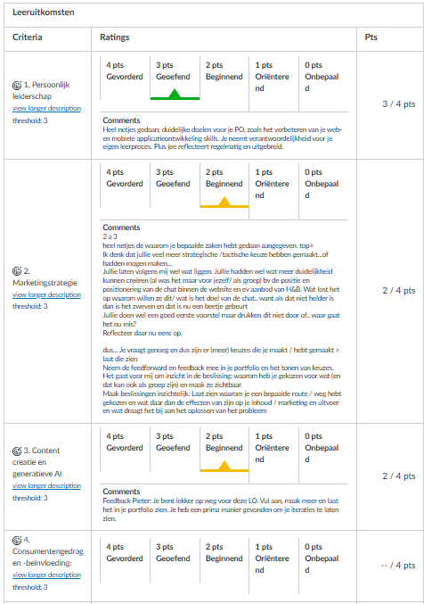 In de onderstaande afbeeldingen is de review van mijn gekozen leeruitkomsten te zien. Dit betreft de tussentijdse beoordeling van mijn portfolio door de docenten. Na de beoordeling ben ik in gesprek gegaan met mijn coach en de docenten om feedback te ontvangen. Deze feedback is terug te vinden in de FeedPulse.